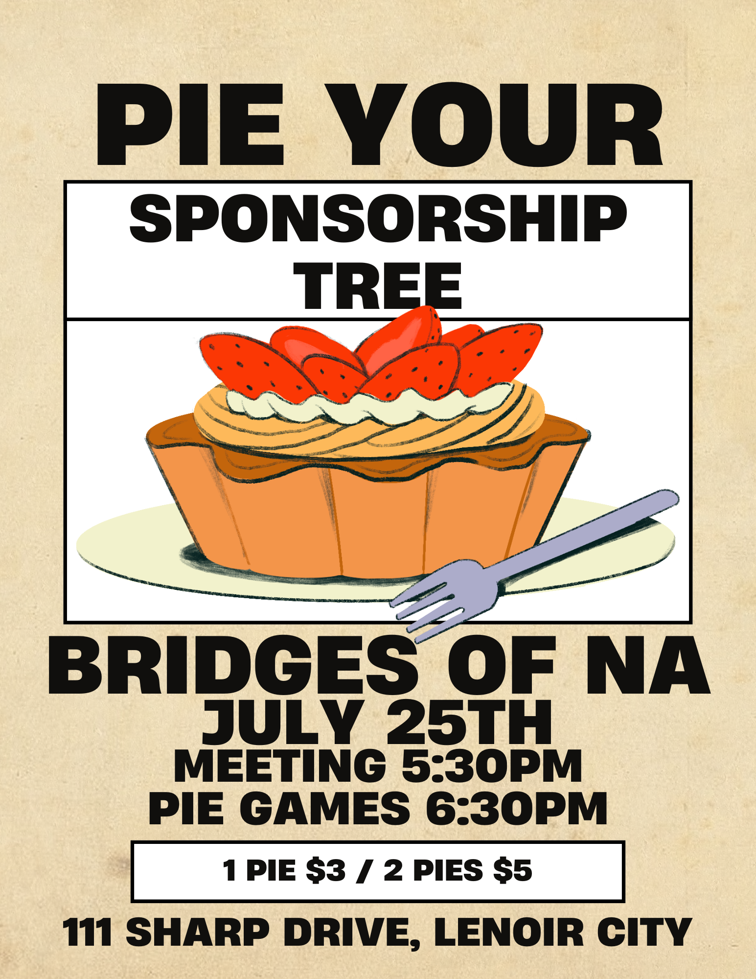 July 25 @ 5:30 pm - 8:00 pm Bridges Presents: Pie Your Sponsorship Tree Day! Bridges of Lenoir City 111 Sharp Drive, Lenoir City, TN, United States